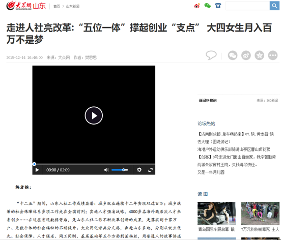 4.走进人社亮改革:“五位一体”撑起创业“支点” 大四女生月入百万不是梦……大众网2015.12.14