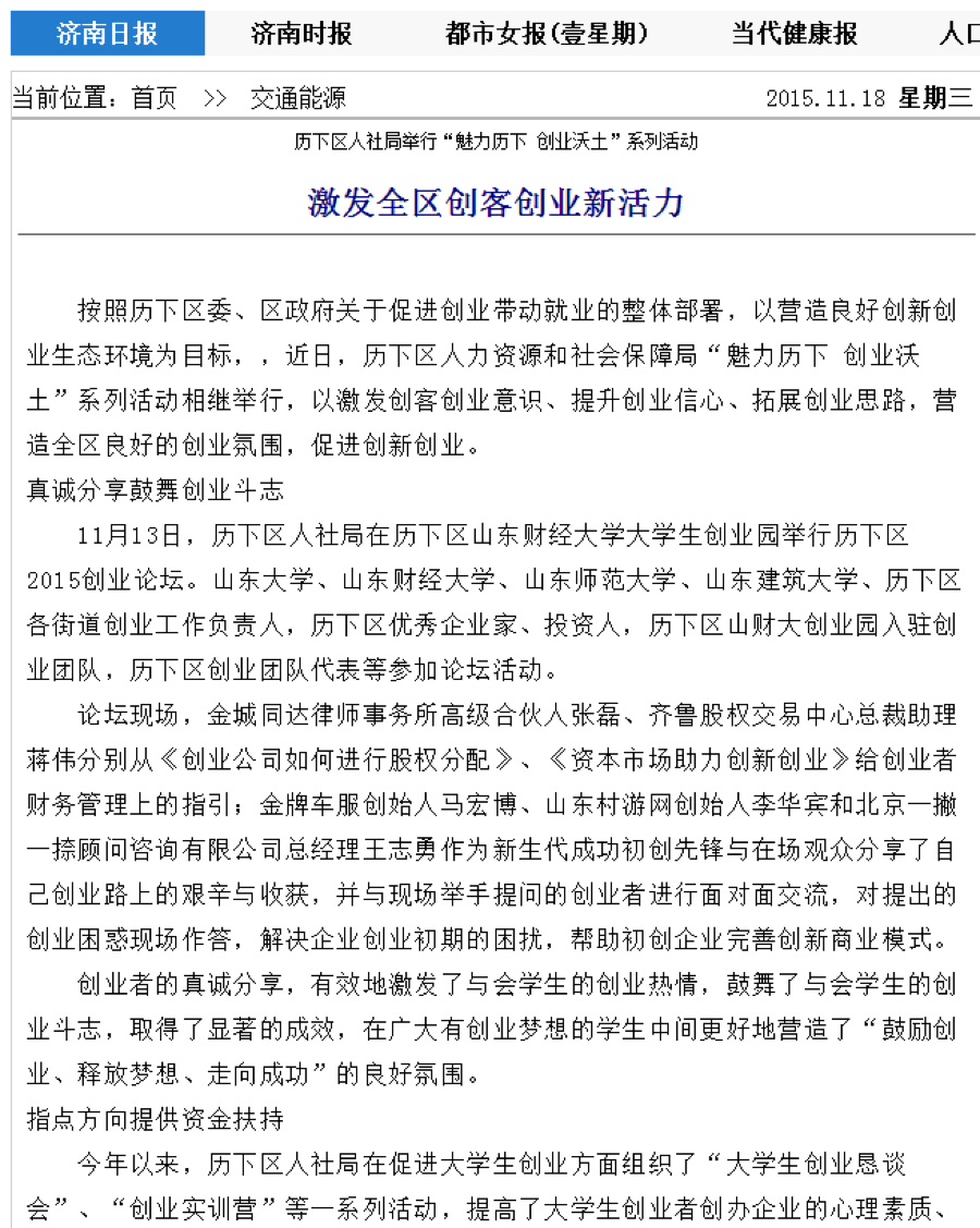 2.历下区山财大大学生创业园恳谈会举行——首批共102个项目入驻……济南日报2015.4.17第A1版
