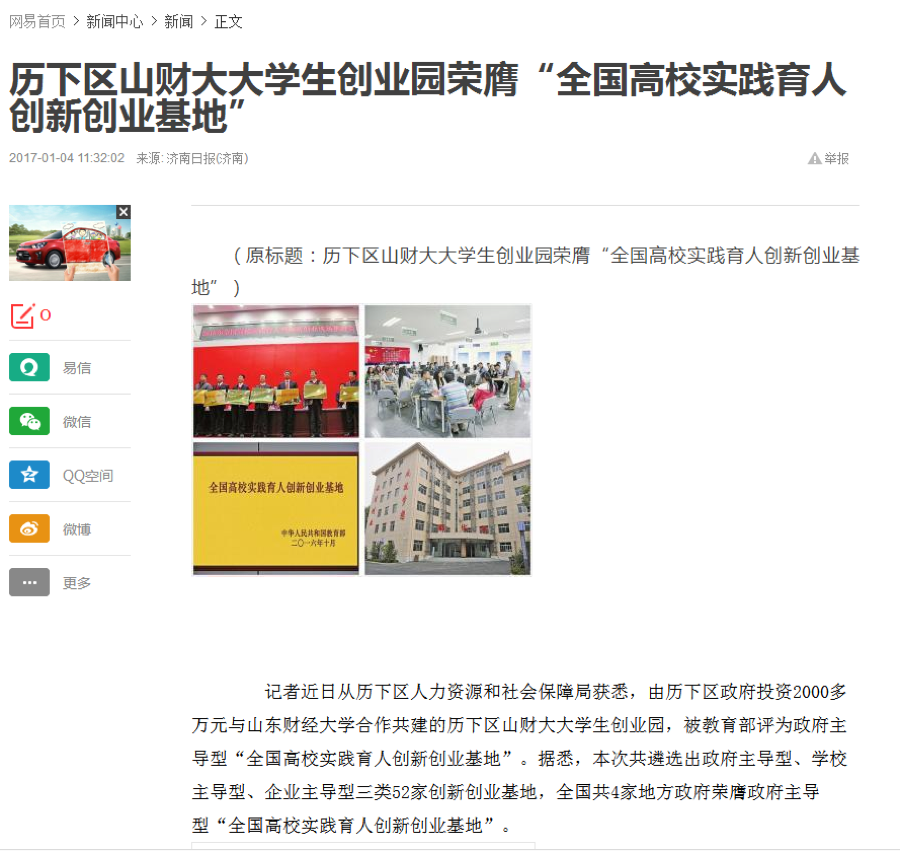 5.历下区山财大大学生创业园荣膺政府主导型“全国高校实践育人创新创业基地” ……网易新闻2017.1.04