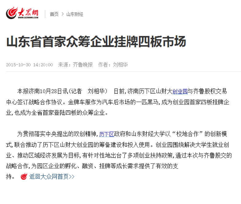 3.山东省首家众筹企业挂牌四板市场……大众网2015.10.30