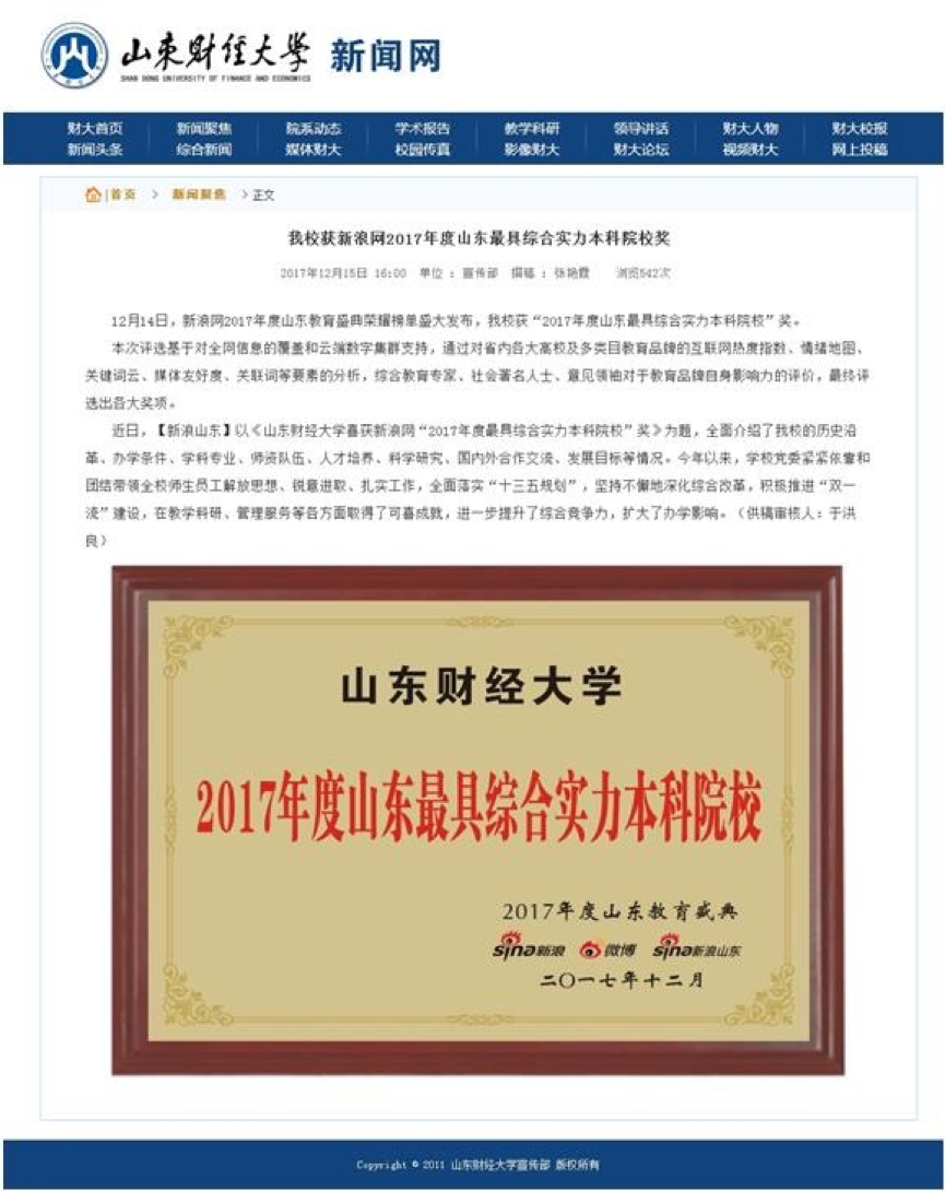 7.山东财经大学获得2017 年度最具综合实力奖……新浪网